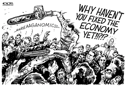 UPDATE: BTW, the two guys who benefited, arguably, the most personally from Reaganomics (these are the folks everything “trickled down” to) are mentioned once or twice in this article. If you want to track where the power animating the Zombie army attacking Obama comes from (i.e. the source of the evil in Zombie movies), that article is a good place to start.