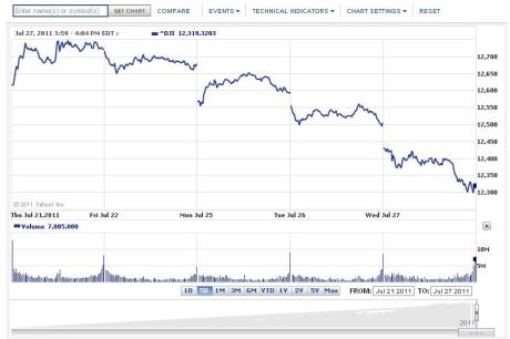 Something to note about the graph…note the huge drops due to “overnight” trading (those are the big gaps where the DJIA opens well lower than where it closed). That’s when the rest of the world takes over for the global economy, and then we open up the floor for trading and recalculate the price of things. What we’ve seen over the last five days is a steady erosion in investor confidence. This is directly due to a manufactured political debt crisis that went critical last Friday.