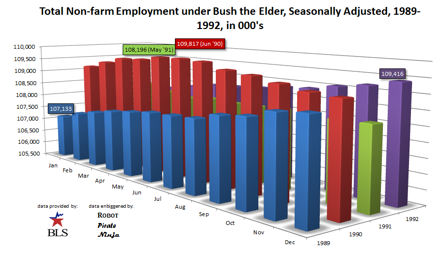 Bush the Elder saw the peak of the Reagan “what’s debt?” economic expansion, and watched as nearly 2M jobs evaporated after peaking in Jun of ’90. Economic recovery in job form came only in the last few months before the 1992 election, not nearly enough to stop the new kid on the block from stealing heart and minds and electoral votes.