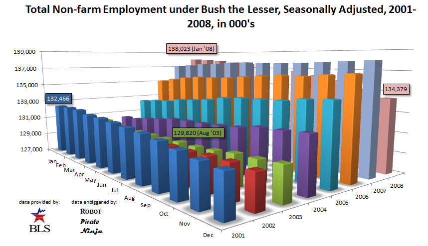 Oh George. What can we do about this one. If you want to see what a bursting real estate bubble looks like? Click on that one. First we see the extended era of peace end on 9/11. Then we see the prosperity depart as we marched to war, hitting the low employment point just as the mission in Iraq was “accomplished.” Then we went on an easy-credit mortgage-fueled home-building binge, topping out with the greatest number of working Americans ever reported, 138,023,000 in January 2008.