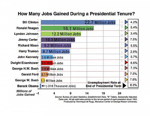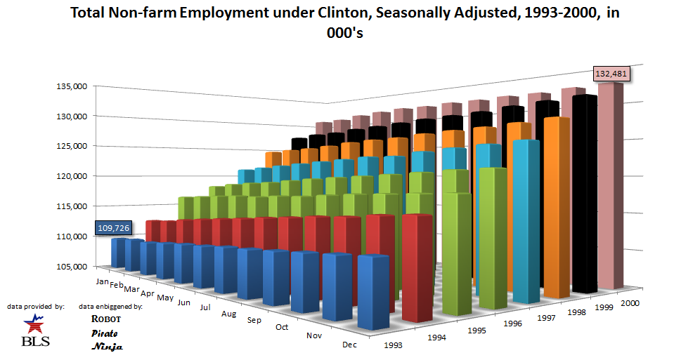 Like all the other graphs, I’ve marked the low and high point in employment during Clinton’s term. That’s how it’s done, folks. Really can’t ask for more. Well…maybe a bit less disgracing the Office of the President. He did, however, get impeached for that. Not sure if it was the peace and prosperity or the blowjob that got him impeached, but something sure made the Republicans mad. It didn’t stick in the Senate, but did doom his VP.