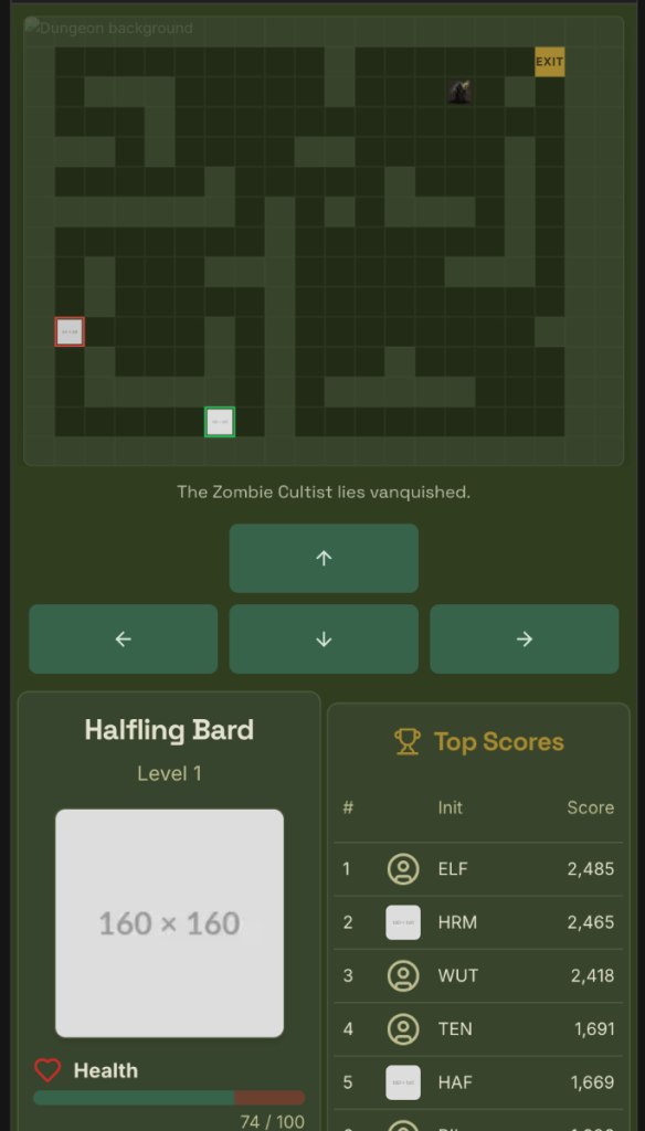 We need some more work on both of these areas. I’d like to switch it up a bit ONLY for mobile. Let’s Put the Dungeon at the top, and the Character card and Monster/Top Score cards underneath, next to each other. In between the, I think we can put a navigation component with arrows for movement. This will then transition to the battle choice when we enter battle mode.