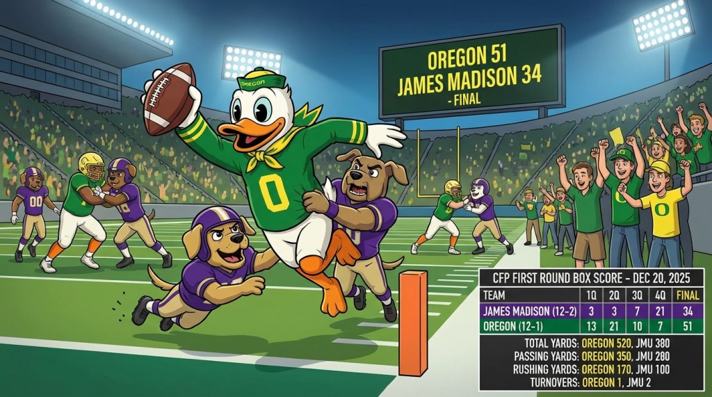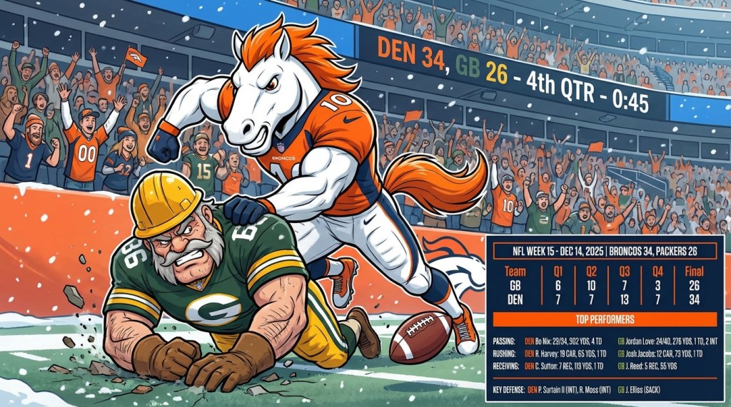 prompt = "Give me an image including a box score for the most recent Denver Broncos football game. (Today is December 20, 2025). Use an animated-looking image for the biggest play as a main part of the image, with the players replaced by versions of that team's mascots. Double check the team and player names before doing the box score and image. Include the stats for the top players in the box score in the bottom right of the image. Make sure and format the text to look professional."