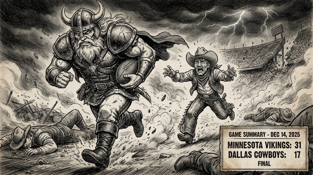 prompt = "Give me an image including a box score for the most recent Dallas Cowboys football game. (Today is December 20, 2025). Use an image for the biggest play of the game as if was hand drawn by Kentaro Miura, with the players replaced by versions of that team's mascots. Double check the team and player names before doing the box score and image. Include the stats for the teams in the box score in the bottom right of the image. Make sure and format the text to look professional."