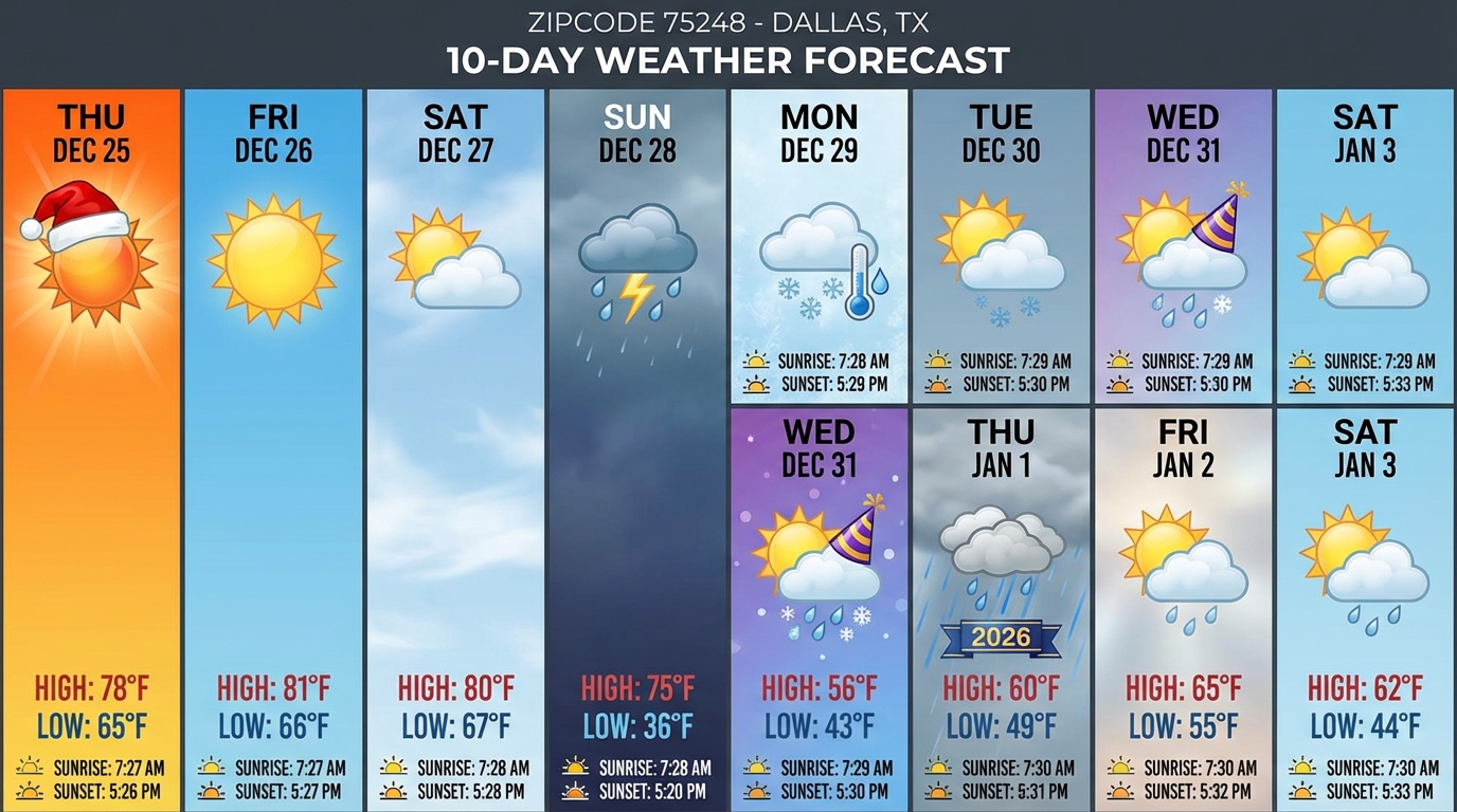 prompt = "Give me an image showing the weather forecast for zip code 75248 for the next 10 days. Be creative with the depiction of special weather events, but make sure to get the High, Low, Sunrise time, and Sunset time for each day."
